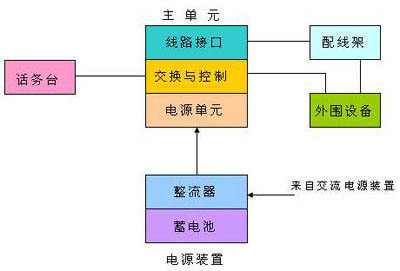 數(shù)字程控交換機由五個基本功能單元組成:主單元、配線架、話務(wù)臺、電源單元、外圍設(shè)備(數(shù)據(jù)通信、計費裝置以及電話和終端)。